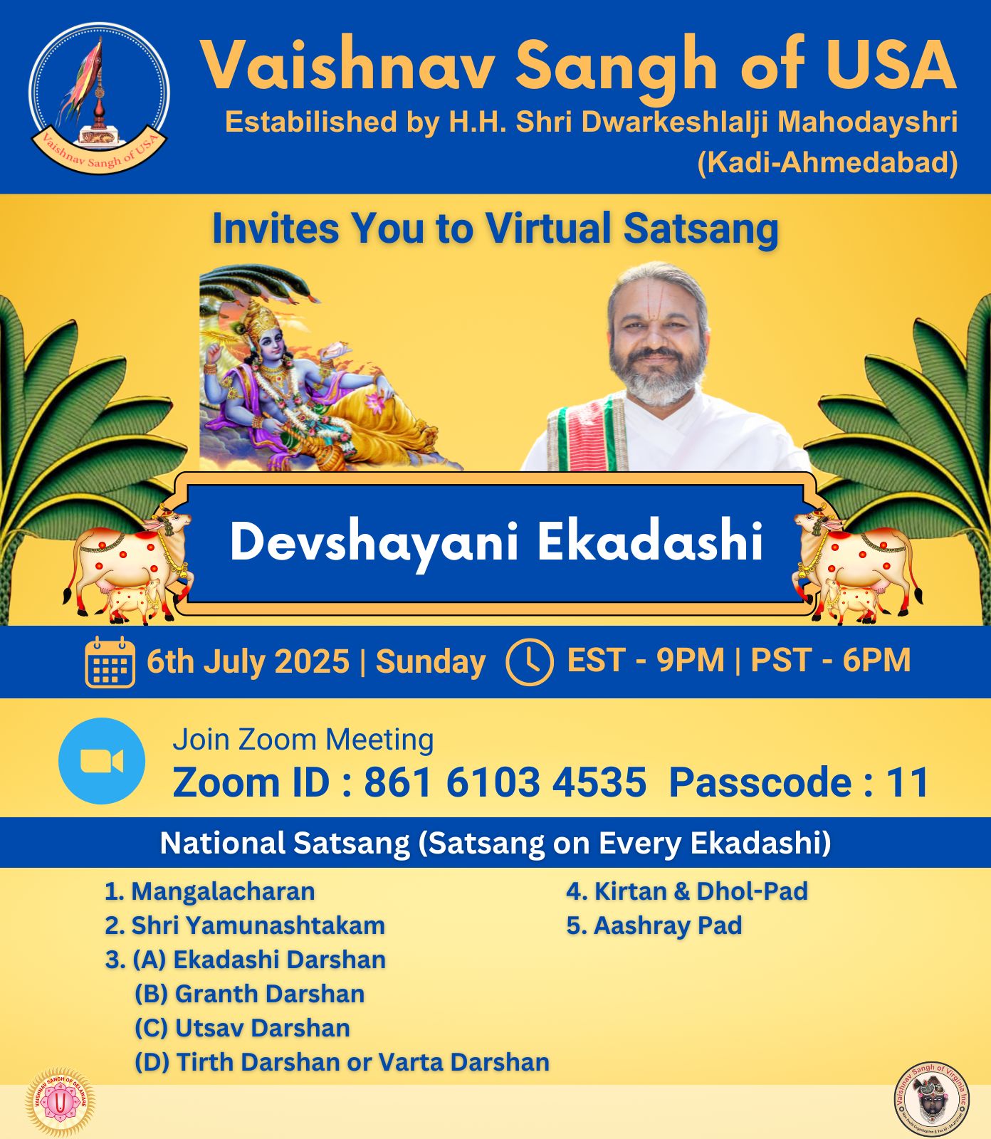 Topic: Devshayani Ekadashi Time: Sunday, July 6th, 2025 at 9:00 PM EST (USA & Canada) Join Zoom Meeting https://zoom.us /j/86161034535 Meeting ID: 861 6103 4535 Passcode: 11