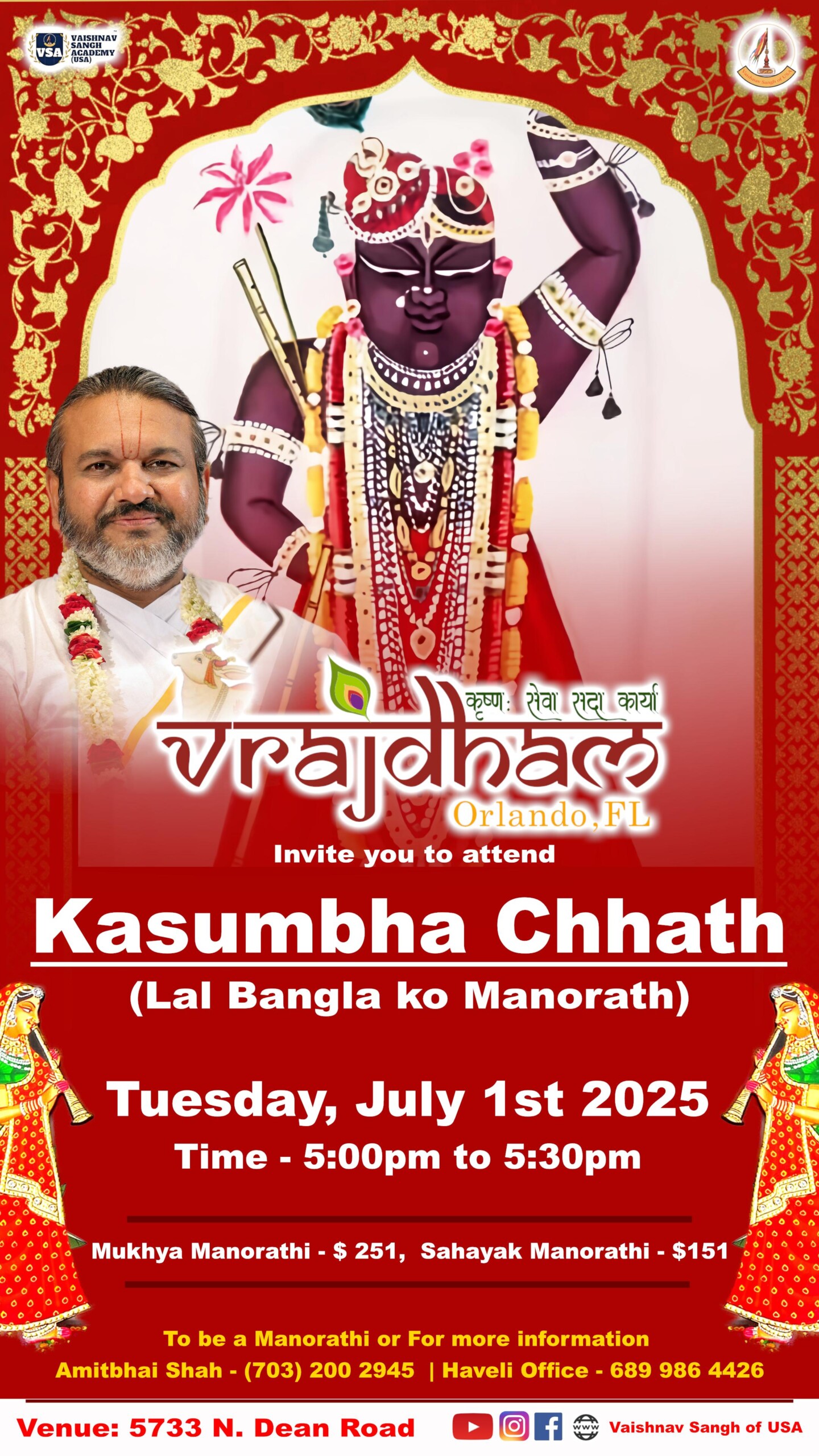 Topic: Kasumbha Chhath Time: Tuesday, July 1st, 2025 from 5:00 PM to 5:30 PM Venue: Vrajdham Haveli 5733 N. Dean Rd, Orlando, FL 32817
