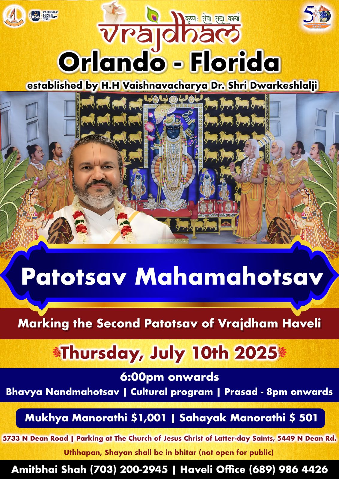 Topic: Patotsav Mahamahotsav Time: Thursday, July 11th, 2025, from 6:00 PM onwards Venue: Vrajdham Haveli 5733 N. Dean Rd, Orlando, FL 32817